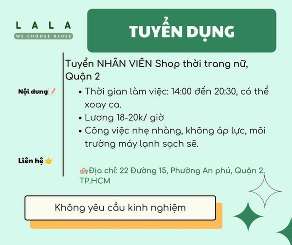 * Công việc: bán hàng và hỗ trợ chăm sóc cửa hàng.